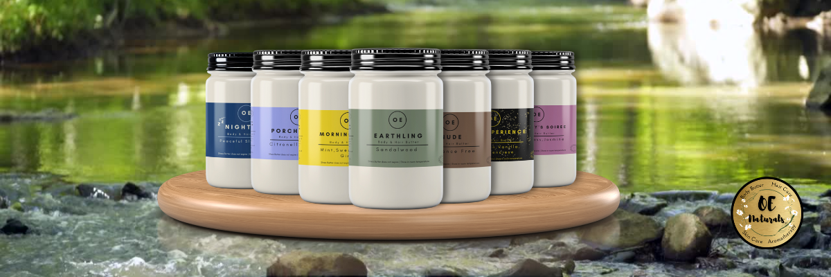 Experience OE Body Butters: crafted for skin and hair, replenishing essential oils, shielding from daily stress, all-natural, no artificial colors or additives. Key ingredient: 100% pure Ghanaian shea butter, blended with natural oils, rose water, and aloe vera. Luxurious, rejuvenating, made with love and respect.
